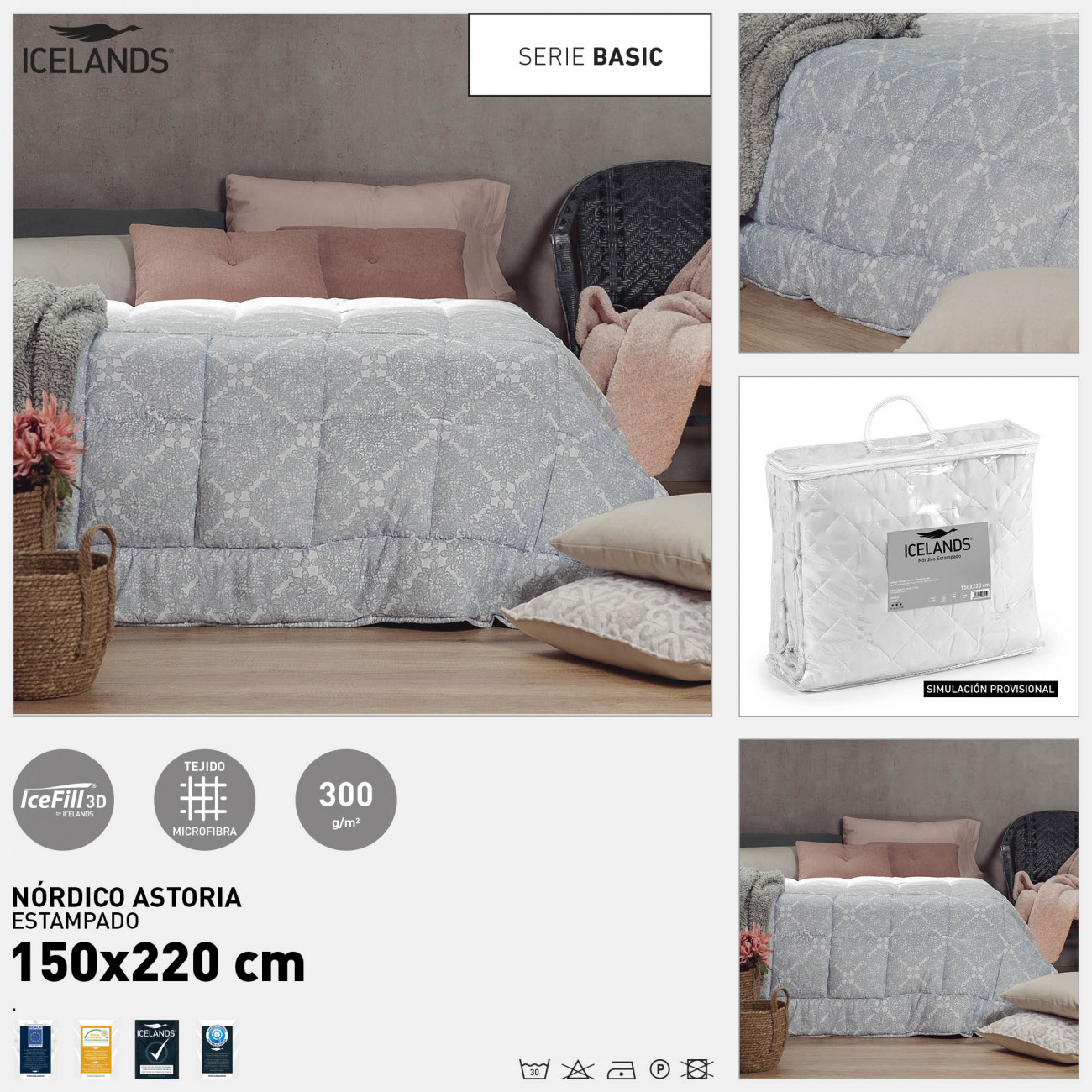 Relleno nórdico nivel térmico 3. Disponible edredón como el de la foto en dos medidas 90-105 y 135-150,éstos incluyen fundas de cojín de 50x70cm.