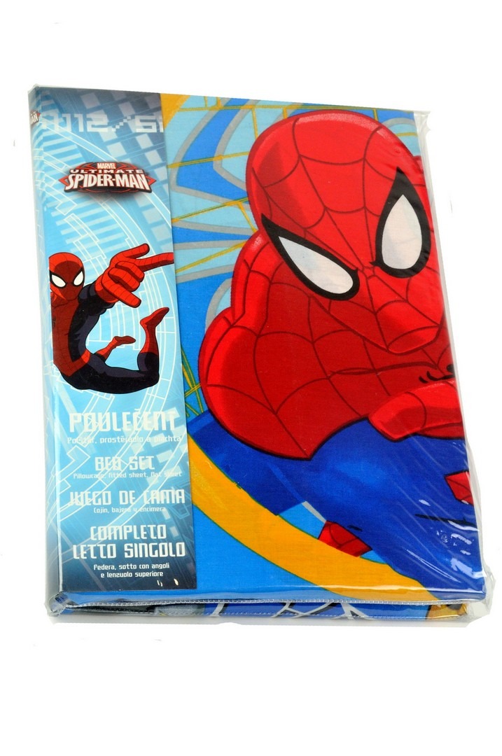 Juego de sábana para cama de 90 con dibujo de Spider-man. Consta de 3 piezas, encimera, bajera y funda de almohada. Composición 100% algodón.